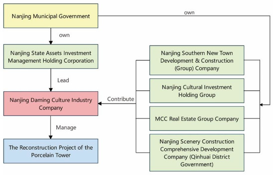 The construction of the modern Porcelain Tower as an urban regeneration project went through a long process. In the Chinese civil construction system, the city government is the principal administrative entity to develop and regenerate local urban areas. Thus, government leaders as city fathers hold the power of decision-making in urban heritage projects. City governments in China, however, normally do not directly invest in and manage heritage projects. Instead, they often delegate local state enterprises as city managers to engage in urban heritage development. For the first time in 2003, the Nanjing municipal government itself undertook the project of pagoda reconstruction and sought to attract investments. Scholars from the Architecture School of Nanjing’s Southeast University, a pioneer in architectural education and one of China’s top research institutions, were then commissioned to examine the history of the Great Bao’en Temple and the Porcelain Tower. One year later, the government announced a reconstruction scheme devised by these scholars, but its potential commercial risk deterred investors, and the government failed to attract sufficient funds. In 2006, the government resorted to assigning its financing to the Nanjing State Assets Investment Management Holding Corporation. This body later managed to convince four other local state enterprises to set up a new company to manage the heritage project (Figure 4). The reconstruction, however, did not launch until 2010 when Chinese businessman Wang Jianlin sponsored the project with the equivalent of 156 million U.S. dollars, the largest personal donation ever made in China. From 2011 to 2013, scholars from Southeast University again designed the modern Porcelain Tower, with construction finally completed in 2016.