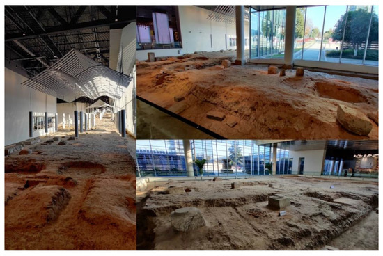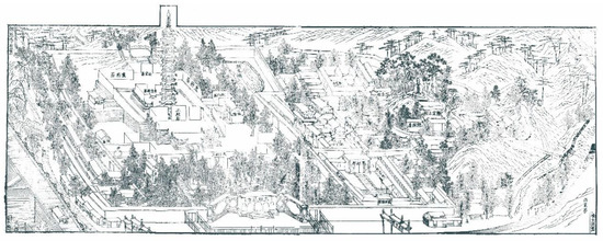The modern Porcelain Tower was constructed in the original’s exact position. According to the image from the book Jingling Fansha Zhi (Buddhist Temples in Jingling) from the Ming period when the Porcelain Tower was built (Figure 5), the original tower was located in the centre of a courtyard enclosed by the walls, corridors, and structures of the Great Bao’en Temple [37]. In the relic areas south of the Nanjing town of the Ming Dynasty, archaeologists made a succession of discoveries including a series of underground ruins of the destroyed tower and temple buildings, stone plinths, and rammed-earth foundations. The entire heritage site was managed as a large public relic park, with the boundary of the temple site and the location of the historical buildings conspicuously marked. To protect and exhibit these ruins, a modern museum was created within a layout similar to the Great Bao’en Temple, while the new pagoda was placed on the middle axis of the museum (Figure 6). The temple ruins discovered are now properly displayed inside the museum without any restoration or reconstruction (Figure 6).
