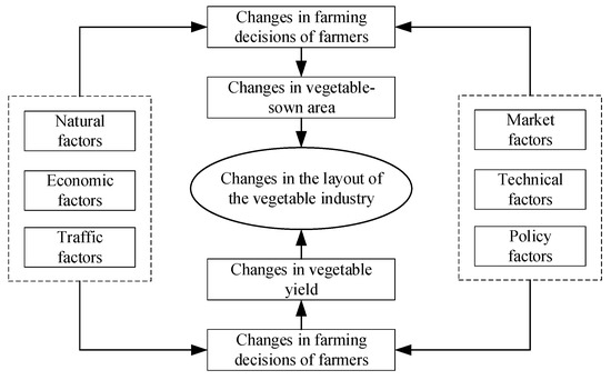 A mature and complete theoretical analysis framework has not been developed for the spatial aggregation of vegetable production. The change in vegetable production layout in China is the result of the combined effect of natural, economic, transportation, market, technology, and policy factors. Among them, natural factors are the most direct factors that cause the change in vegetable production layout, while economic, transportation, market, and technology factors have indirect effects on the shift in production layout by affecting the cost and income of vegetable cultivation. The above factors influence the vegetable planting decision of farmers, which in turn affects the change of vegetable planting area and yield, leading to a shift in vegetable production layout. This study analyzes the influence mechanism of changing vegetable production layout in China based on agricultural location theory, industrial layout theory, and new economic geography theory. It constructs a theoretical analysis framework regarding natural resource endowment, urbanization level, and transportation conditions (see Figure 1).
