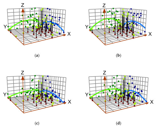 The study further presented the trend graphs of vegetable sowing area and yield in 2010 and 2019 by using the global trend analysis method of ArcGIS geostatistical analysis. The outcome reveals that the vegetable-sown area and yield in 2010 and 2019 were produced with due east and due north directions as the X and Y axes and vegetable-sown area and production as the height attribute values (Z-axis), respectively (see Figure 2). Figure 3a,b shows that the vegetable-sown area in China offers an obvious inverted U-shaped trend in the east–west and north–south directions. The east is higher than the west, and the south is higher than the north. Likewise, the inverted U-shaped characteristic of the projected trend line of vegetable production is more moderate, and the east is higher than the west, which is still obvious as shown in Figure 3c,d. From the above results, it is apparent that both vegetable-sown area and vegetable production in China in 2019 showed an increase compared to 2010, and the inverted U-shaped characteristics of vegetable planted area in the spatial trend are also found to be more apparent compared to vegetable production.