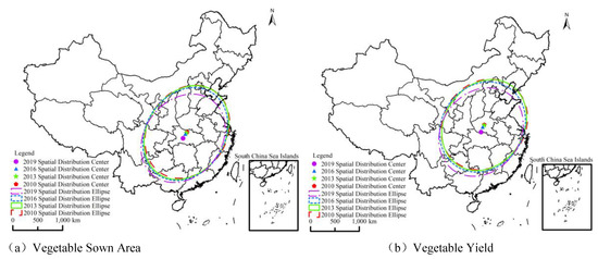 Standard deviation ellipse of vegetable-sown area and yield in China: (a) vegetable-sown area; (b) vegetable yield.