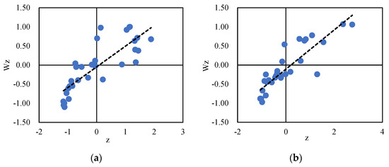 To further investigate the spatial agglomeration characteristics and spillover effects, the spatial correlation of vegetable production agglomeration in China was examined by using the global and local spatial correlation indices in Exploratory Spatial Data Analysis (ESDA). The global spatial correlation is measured by Moran’s I index, which is calculated by Moran [29] and Anselin [30]. Local spatial correlations and spatial clustering characteristics are described by plotting Moran’s scatter plot. The weight matrix used in this paper is the economic, spatial weight matrix (W), where i and j represent cell i and j, respectively, E is a matrix describing the inter-regional variability, and yit is the actual regional value added of the primary industry in the ith province in year t, calculated as , .