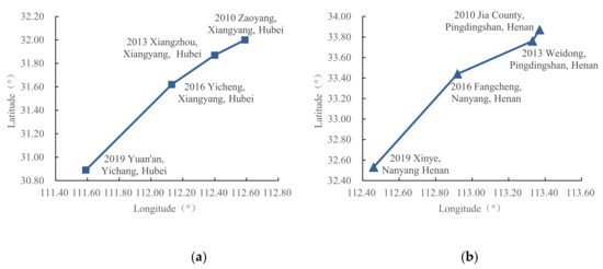 In addition, the movement of the center of gravity of vegetable production in China is also plotted (see Figure 6) based on the coordinates of the ellipse center of the standard deviation of the Chinese vegetable industry calculated in the previous section. It is apparent from the figure that compared to 2010, the vegetable-sown area in 2019 showed a trend of moving to the southwest with an azimuthal change of 7°. The ellipse center shifted from Zaoyang City, Xiangyang City, Hubei Province (112.59° E, 32.00° N) to Yuan’an County, Yichang City, Hubei Province (111.59° E, 30.89° N), with a total of 155.67 km in the southwest distance. From the standard deviation ellipse parameters of vegetable production, the long and short semi-axes of the ellipse showed an overall shortening trend (the short semi-axis of the ellipse increased slightly in 2016 compared with 2013), the spatial agglomeration rose from 0.41 in 2010 to 0.44 in 2019, the azimuthal angle changed by 1.7°, and the center of gravity of distribution shifted 12.78 km to the southwest from 2010 to 2013 (from Jia County, Pingdingshan City, Henan Province to Weidong County, Pingdingshan City, Henan Province), 52.04 km to the southwest from 2013 to 2016 (from Weidong County, Pingdingshan City, Henan Province to Fangcheng County, Nanyang City, Henan Province), and 109.91 km to the southwest from 2016 to 2019 (from Fangcheng County, Nanyang City, Henan Province to Xinye County, Nanyang City, Henan Province). This shows that the trend of agglomeration in the distribution of vegetable production in China is becoming more and more obvious, and the center of gravity has accelerated in the southwestern direction.