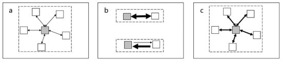Different relations amongst nodes in an urban network. (a) A node is connected with a plurality of nodes, but the connection is not strong; (b) The connection between nodes is very strong, but there are few connected nodes or the inflows and outflows are very different; (c) Nodes are not only connected with multiple nodes, but also have strong connection strength.