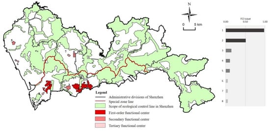Based on the FCI value, the identified employment centers are graded by the natural discontinuity method (summary statistics for the variables shown in Table 1). Figure 3 shows the functional centrality levels of the identified centers. The results show that the eight employment centers include two first-level functional centers (FCI values of 0.996 and 0.561), three second-level functional centers (FCI values of 0.177, 0.135, and 0.135), and three third-level functional centers (FCI values of 0.069, 0.066, and 0.077). From the perspective of spatial distribution, the first-level functional centers are distributed in Futian District and Nanshan District, whereas the second- and third-level functional centers are scattered, showing that, as they are affected by the location advantages of Nanshan District and Futian District, Futian–Luohu center, and Kejiyuan center, they have a strong functional connection within the whole region and the greatest influence on other areas. Furthermore, the functional centrality of the centers distributed inside and outside the special zone is quite different, which means that the functional connection of each employment center is unbalanced. In other words, the functional centrality in the special zone is stronger than outside the special zone, and the employment centers distributed inside the special zone have a stronger functional influence. From the level of each center, we can find differences in the morphological and functional levels of some centers, such as the Kejiyuan, Chegongmiao, Songhe, and Aviation City centers. Specifically, the morphological level of Kejiyuan center is the second, whereas the functional level is the first. The morphological level of the Chegongmiao, Songhe, and Aviation City centers are third, whereas the functional level is second, showing a mismatch between the employment population aggregation and functional connections of these centers. The distributed employment population can generate stronger commuter flows, which leads to the functional level of these centers, being one level higher than the morphological level.