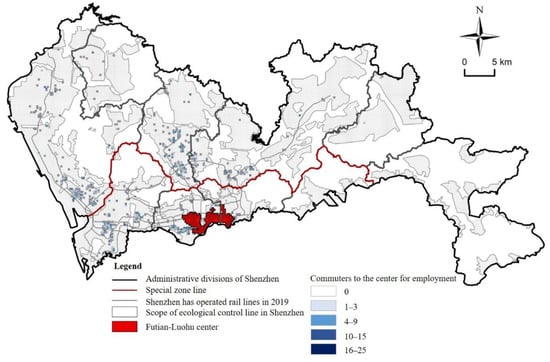 According to Figure 5, although the functional centralities of the Kejiyuan and Futian–Luohu centers are at the first level, the influence area of Kejiyuan center is much smaller than that of Futian–Luohu center. The influence area of Kejiyuan center is mainly distributed at the south of Kejiyuan center, the boundary area of the Futian and Luohu Districts, as well as scattered in Longhua District and west of Bao’an District. According to the results, Kejiyuan center has a strong connection to Futian–Luohu area, indicating a spatial interaction between the Futian–Luohu and Kejiyuan centers. Many science parks and high-tech zones are located in Kejiyuan center and have attracted many people residing in Futian and Luohu to work in this employment center.