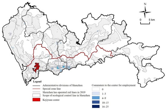 Based on the OD data, we further investigated the functional centrality of the first-level functional centers, including Futian–Luohu center and Kejiyuan center. Residence-employment connections whose starting and ending points are all distributed in Futian–Luohu center and Kejiyuan center are excluded. Figure 4 and Figure 5 show the influence area of Futian–Luohu center and Kejiyuan center, respectively. According to the results, the Futian–Luohu employment center has many functional connections to the whole city. Many people lived in the midwest of Shenzhen and some people in the east worked in Futian–Luohu employment center. The affected area is mainly located in four districts: Nanshan District, Bao’an District, Longhua District and Longgang District. Nanshan District is the closest to Futian–Luohu center in space, and has the advantage of a short commuting distance. Many residential areas, such as urban villages, are found near the special zone line in Bao’an District and Longhua District, showing that Futian–Luohu center provides many jobs for the population lived in these areas. The influence area is mainly distributed along the metro line in the westernmost part of Bao’an District and Longgang District.