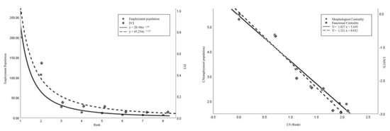 This study curve fit the employment population and FCI value of different employment centers to measure the distribution equilibrium degree of each employment center’s morphological and functional centrality. The method is applied as follows. The logarithm is taken as the horizontal axis for the ranking of each center. Then, the logarithm of the employment population and FCI values of each center are taken as the vertical axis for linear fitting. Next, the logarithm is taken. According to Figure 7, the fitted curve is shaped like an “L”, and the absolute value of the slope is greater than 1, which shows the unbalanced morphological and functional centrality of the centers, as well as a monocentric employment spatial structure. In other words, Futian–Luohu center still concentrates most on the employment population and is in the dominant position of the employment–residence network in the city. We further compared the slope of the two fitting lines to understand the distribution of the morphological and functional centrality of the identified employment centers. The results show that the distribution of morphological centrality in employment centers is even more concentrated than that of functional centrality. According to the results, the employment spatial structure of Shenzhen is still monocentric in the morphological and functional perspectives.