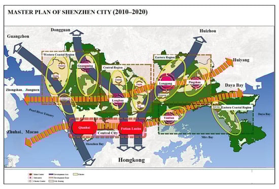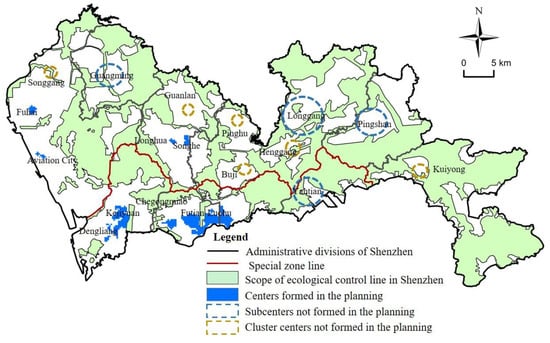 China’s urban development is deeply affected by the intervention of urban planning and relevant policies []. Since its establishment of a special economic zone, the Shenzhen government has adopted polycentric development as an important spatial strategy. The Shenzhen 2010 master plan proposed building a ‘2 + 5 + 8’ three-level polycentric urban spatial structure system that includes two main centers, five subcenters, and eight cluster centers (Figure 8). Our study shows that the master plan has played an important role in the formation of the spatial structures of Shenzhen. Figure 9 shows the center, subcenters, and cluster centers that were formed, or not formed, during the planning period. The urban development of Shenzhen is generally in line with the planning. The identified eight employment centers are all located within the planned urban centers. This finding reflects Sorensen’s (2001) argument that the powerful structure plan contributed to the trend of urban spatial structure development. Strong government intervention measures and planning policies can promote the growth of employment centers in metropolitan areas, in order to cope with urban sprawl []. For example, Futian–Luohu and Kejiyuan were planned to become a R&D center that developed high-tech industries and became the hub of industrial clusters in Shenzhen. As a consequence, a large number of enterprises have been attracted to be located in Futian–Luohu and Kejiyuan, thereby promoting employment and local economic development.
