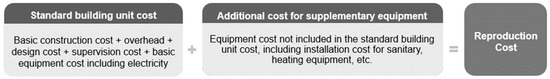 The simplest property value assessment method is its comparison with the market prices of similar properties that have been recently traded in the surrounding area, or the addition of land value to the building value as estimated by the replacement cost method. However, it is limited by the access to market price data. In this case, the only possible valuation method is the area-based method. However, the traditional area-based method may not account for factors such as the quality of buildings and improvements or access to amenities. This method results in inequality because, in a given region, the same flat tax amount is assigned regardless of the actual market value [15]. This issue can be resolved by adjusting the flat tax amount for the given region, based on the locational values. Through this standard adjustment process, the taxable values approach the market values, improving equity. Similar examples of a hybrid valuation system can be found in other countries such as Chile, Indonesia, and Romania [15,25]. However, the hybrid valuation method proposed in this study may be better, as the flat tax amount is adjusted based on several characteristics that affect locational values. In this adjustment process, we suggest using the valuers’ knowledge and experience because the estimated taxable values are much closer to the property values, which include locational values. The assessment of buildings and improvements considering locational values is presented below.