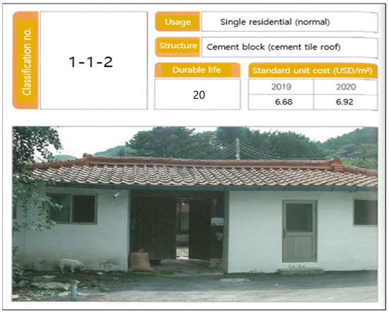 For example, as shown in Figure 3, the standard unit cost for an average-grade, single-residential, cement block residential building (classification no. 1-1-2) would be 6.92 USD/m2, with a durable life of 20 years.
