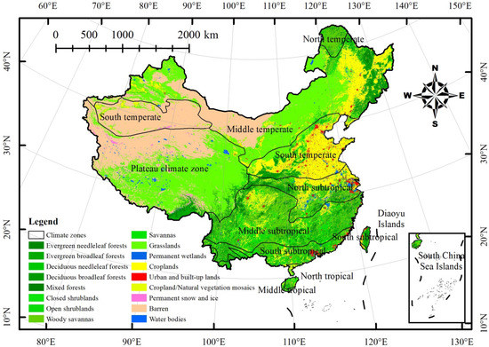 - Croplands were mainly distributed in the northeast middle temperate, south temperate, and north subtropical zones. Barren lands were mainly distributed in the south temperate, middle temperate, and northwest plateau climate zones. Grasslands were mainly distributed in northwest China. Forests were mainly distributed in southern China subtropical, tropical, and northeastern temperate zones. Urban and built-up areas were mainly distributed in eastern coastal areas.