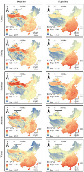 - Overall, the maximum and minimum LSTs during the day were higher than those at night. LST also showed seasonal differences. During the daytime, the maximum LST decreased from that in summer (63.25 °C) > spring (46.55 °C) > autumn (37.50 °C) > winter (31.94 °C), whereas at night, the maximum LST decreased from that in summer (32.44 °C) > autumn (26.83 °C) > spring (26.78 °C) > winter (22.12 °C).