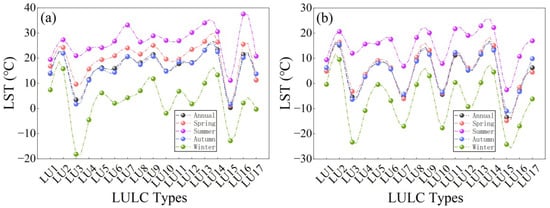 Mean land surface temperature (LST) values of different land use/land cover (LULC) types in the daytime and nighttime, in each season and annually. LU1–LU17 represent evergreen needleleaf forests, evergreen broadleaf forests, deciduous needleleaf forests, deciduous broadleaf forests, mixed forests, closed shrublands, open shrublands, woody savannas, savannas, grasslands, permanent wetlands, croplands, urban and built-up lands, cropland/natural vegetation mosaics, permanent snow and ice, barren land, and water bodies, respectively. (a) Daytime; (b) nighttime.