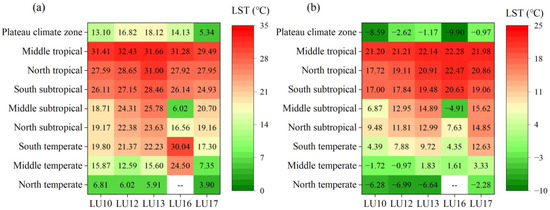 Distribution map of mean daytime and nighttime annual land surface temperature (LST) in different land use/land cover (LULC) types in different climate zones of China. LU10, LU12, LU13, LU16, and LU17 represent grasslands, croplands, urban and built-up lands, barren land, and water bodies, respectively. (a) Daytime; (b) nighttime.