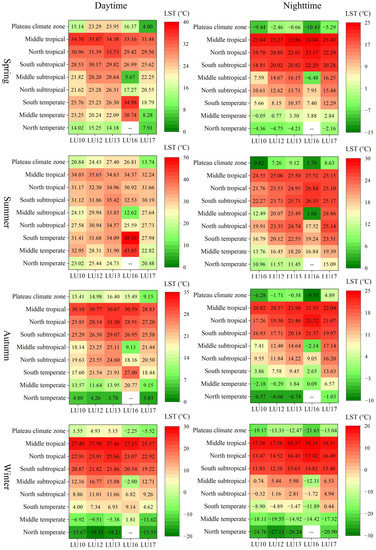 LST also shows seasonal differences under different LULCs [68,69]. For example, Yang et al. [27] analyzed the relationship between LCZ and LST and found that the mean LST in barren land was lower than most building types in summer but higher than most building types in winter. To further analyze the seasonal difference of the mean LST of each LULC type under different climate zones, in this study we calculated the seasonal difference of LST of LULC types under different climate zones (Figure 6). The results showed that, for the same LULC type (except LU16), during the daytime in spring and summer, the mean LST of each LULC type first decreased, then increased, and then decreased again with the increase of the latitude of the climate zones (except the plateau climate zone). However, during the daytime in autumn and winter, and at night in all seasons, the mean LST of each LULC type showed a decreasing trend with the increase of the latitude of the climate zones (except the plateau climate zone), which was consistent with the annual mean LST results. For the same climate zone, there were differences in the mean LST of each LULC type in different seasons. Taking the north temperate zone as an example, in daytime in spring and summer, the mean LST showed a trend of LU12 > LU13 > LU10 > LU17; and in daytime in autumn, the mean LST showed a trend of LU10 > LU12 > LU13 > LU17. In daytime in winter, the mean LST showed a trend of LU17 > LU10 > LU13 > LU12, which was mainly due to the location of the north temperate zone in the northernmost part of China. This area is covered with a large amount of snow and ice in winter, resulting in a decrease in the LST to a lower temperature than that of water bodies. In the context of the frequent occurrence of the global urban heat island effect, the LULC types with lower LSTs in each climatic zone can be identified by comparing the difference in mean LSTs in different LULC types in different climatic zones. Then, the proportions of the areas of these LULC types can be increased to alleviate the LST. This study shows that the proportions of water bodies and grassland areas in each climate zone can be increased to reduce the LST.