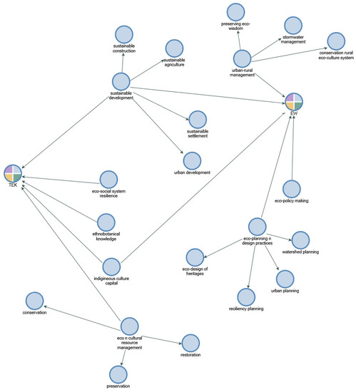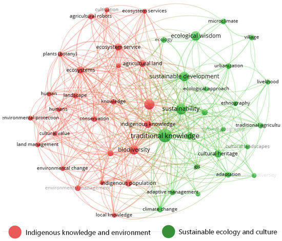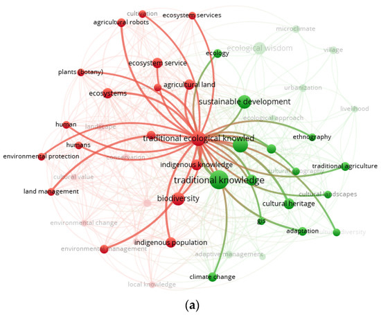 | Cluster 1: Indigenous knowledge and environment (red nodes) N = 25 | Agricultural land, agricultural robot, biodiversity, conservation, cultivation, cultural value, ecosystem services, ecosystem, environmental change, environmental management, environmental protection, human, indigenous knowledge, indigenous people, indigenous population, knowledge, land management, landscape, local knowledge, management practice, plants (botany), productivity, traditional ecological knowledge |