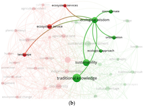 | Cluster 2: Sustainable ecology and culture (green nodes) N = 23 | Adaptation, adaptive management, biocultural diversity, climate change, cultural geography, cultural heritage, cultural landscape, ecological approach, ecological wisdom, ecology, ethnography, GIS, land-use change, landscape ecology, livelihood, microclimate, sustainability, sustainable development, traditional agriculture, traditional knowledge, urbanization, village |