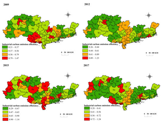 The super-efficient SBM model with the variable returns to scale (VRS) condition constraint was adopted in this work to estimate the ICEE in the PRB region, and four years, 2009, 2012, 2015, and 2017, were selected for analysis (Table 4).