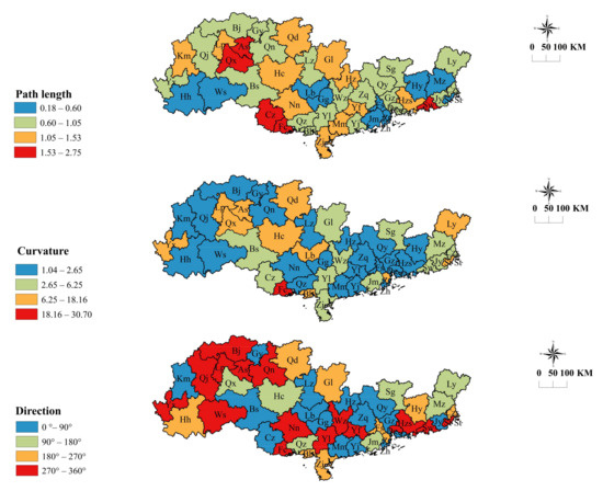 where, m(Di,1, Di,T) is the city unit i’s traveling distance from the first to the last year. The greater the value of f, the more twisted the LISA time path will be and the more sinuous the local spatial structural volatility; if f > 1, this indicates that the moving curvature of the city unit i is higher than the average value.