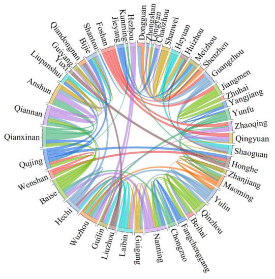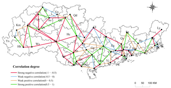 This study carved out the spatiotemporal network of ICEE interaction across surrounding cities to further show the spatial aspect underlying the visualization of ICEE (Figure 4 and Figure 5). From the geographical network diagram and the pattern of a topological network of ICEE in the PRB, 102 pairs of negative correlations can be observed, accounting for 49.04%. It can be seen that there was a certain degree of spatiotemporal competition in the evolution of ICEE among neighboring cities. Among the negative associations, 35.29% were weak negative associations, mainly concentrated in the neighboring cities of Guangdong, with a small amount distributed in Guizhou. The pattern of ICEE among neighboring cities was consistent with the evolutionary process of divergence, diffusion, and convergence from the standpoint of development geography theories and laws. Additionally, the imbalance of geographic resource endowment exacerbated the competitive relationship of ICEE among cities, which limited regional development to some extent. The strong negative correlation between Guangzhou and Dongguan, Foshan and Qingyuan, and Nanning and Laibin revealed the uncoordinated characteristics of ICEE development. In each city, there may be some regional attempts at ICE reduction. On the other hand, cities such as Anshun and Bijie, Zhuhai and Jiangmen, Qinzhou and Fangchenggang constituted a strong synergistic area, showing the spatial dynamic of positive synergy; the characteristics of ICEE in these cities were relatively similar, and the geographical concentration of ICEE was revealed.