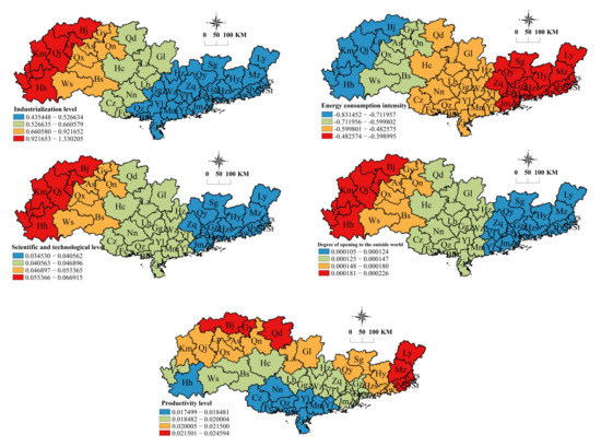 The spatial variation of ICEE was influenced by the industrialization level, openness to the outside world, the science and technology level, energy consumption intensity, and productivity level, among which the productivity level, industrialization level, and openness to the outside world were the dominant influencing factors. Different driving factors had different influences on the spatial variation of ICEE. The interplay of the components improved the explanatory power of ICEE’s spatial variation, and the augmentation was mostly non-linear.