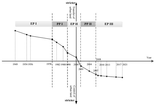 The process of urban land system reform in China (1949–2021). Note: (1) Source—The figure was drawn by the authors according to the division of equilibrium and punctuated periods in the above analysis. (2) EP represents an equilibrium period; PP represents a punctuated period. (3) The meaning of the horizontal axis is the year. There are typical land policies which were introduced in the year marked on the horizontal axis. (4) The upper half of the vertical axis reflects the intensity of the restriction on the transfer of urban land. The larger the vertical coordinate of the turning-point on the polyline, the stricter the land policies of the corresponding year regarding the transfer of urban land. (5) The lower half of the vertical axis represents the intensity of local governments’ control of urban land. The greater the distance between the turning-point and the horizontal axis, the stricter the control of urban land by local governments in the corresponding year. (6) The intersection of the horizontal and vertical axis is not the mathematical origin where the horizontal and vertical coordinates are both zero, but the year 2000. The intersection of the line with the vertical axis is located above the horizontal axis, which means that the transfer of urban land was less restricted in 2000, but not completely free. (7) The intersection of the line with the vertical axis does not represent any year, and is not mathematically significant.
