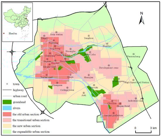 Huai’an is the city traversed by four waterways (Salt River, Ancient Huai River, the Li Canal, and the Grand Canal from north to south, see Figure 1). We divided the central urban area into the following four sections according to the age at which they were developed and constructed: (1) The section developed and constructed before 2000, which accounted for 16.04% of the study area. Because this section includes the old urban area centered on Huaihai Road and the old urban area of Chuzhou District centered on the ancient prefecture, we referred to this section as the old urban section. (2) The section developed and constructed from 2000 to 2010, which accounted for 21.27% of the study area. This section is mainly at the periphery of the old urban section, and we therefore referred to it as the transitional urban section. (3) The section developed and constructed after 2010, which accounted for 30.74% of the study area. This section is at the periphery of the transitional urban section and connects Huai’an City and Chuzhou District. We referred to this section as the new urban section. (4) The expandable urban section, which accounted for 31.95% of the study area. This section is expected to be developed in the future.