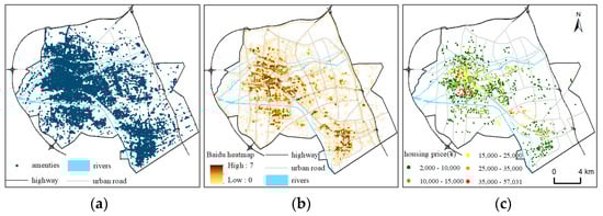 Spatial distribution of Supply and Demand data. (a) the distribution of all amenities; (b) the distribution of Baidu population heatmap data; (c) the distribution of residential housing prices.