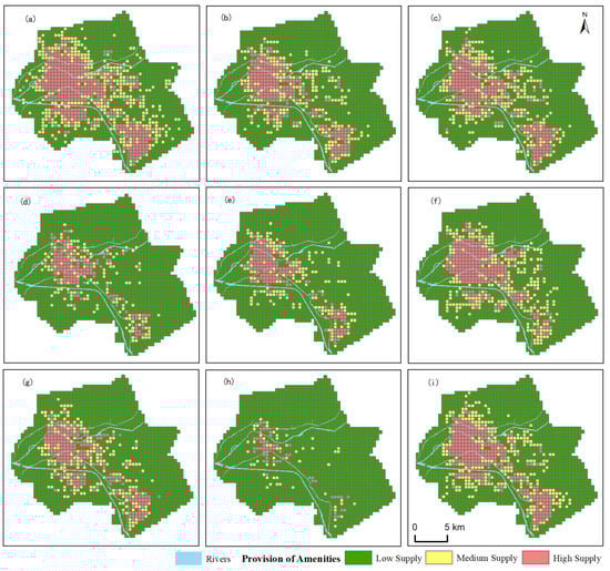 The supply index reflected the quantity of amenities and the availability of different types of amenities. According to the supply index for all amenities and those for different types of amenities (Figure 3), the two agglomerations centered on the old urban areas of Huai’an City and Chuzhou District had high supplies of amenities. Yingzhong, Shuidukou, Shanyang, Eco-city, and College Town also had high supplies of amenities. The high-supply areas were arranged in both clustered and scattered distributions. Notably, although we identified dotted areas with high amenity supply levels between the two old urban sections, they did not form a linear amenity corridor connecting the two old urban sections. The medium-supply areas were mainly located at the periphery of the high-supply areas; and the low-supply areas were mainly located at the periphery of the medium supply areas in an annular distribution. We identified considerable differences in supply among different sections. In the old urban section, both the overall supply index and the supply indices for different types of amenities were high. The medium-supply areas were mostly located in the transitional and new urban sections; however, the number of low-supply grids in the grid was higher than the number of medium-supply grids, and the number of medium-supply grids was higher than the number of high-supply grids. The expandable section consisted primarily of low-supply grids.
