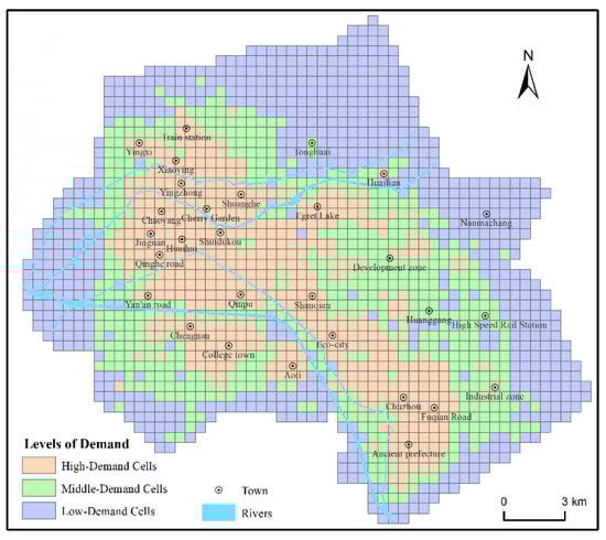 The demand index reflected the number of residents in each section and their level of demand for amenities. Shanyang and Eco-city, which connected the old urban areas of Huai’an and Chuzhou District, constituted a high-demand area. In recent years, large-scale public amenities, such as the Huai’an Municipal Government, libraries, theaters, and high-quality primary and secondary schools, were built in Eco-city, have resulted in population agglomeration in the middle between the two old urban areas, thus promoting a strong connection between the areas. Chengnan and College Town, located in the area along the south bank of the Grand Canal, as well as Aoti and Egret Lake were also high-demand areas. The medium-demand areas were primarily located at the peripheries of the high-demand areas, whereas most of the low-demand areas were at the periphery of the central urban area. Residents’ demand for amenities followed a circular distribution pattern (Figure 4).