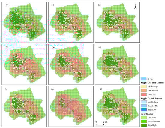 To identify the spatial distribution of supply of and demand for amenities, we performed range normalization on the supply index Si and demand index Di to obtain values between 0 and 1. Grids with values were equally divided into low, medium, and high levels according to the order of the supply and demand indices. Grids without values were classified into the low level. The supply and demand levels were paired, and nine supply–demand relationships were obtained (Table 2).