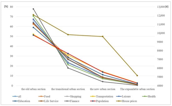 We estimated the proportions of amenity quantity and population (Figure 7) and discovered that the proportions of amenities and population were highest in the old urban section. The proportions decreased from the old urban section to the transitional, new, and expandable urban sections. The decrease in proportion from the old urban section to the transitional urban section was the largest. The slopes of the decreases differed according to the types of the amenities and decreased in the following order: finance, health, shopping, leisure, food, life services, educational, and transportation amenities. The curve was similar to the rent curve []. Thus, quantitative proportions of supply and demand components were positively correlated with the oldness of urban development.