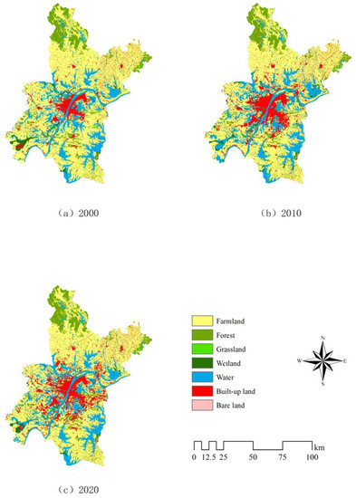 The land use data of Wuhan in the periods of 2000, 2010, and 2020 are reclassified to obtain the land use change map. From Figure 2, it can be seen that the main types of land use in Wuhan during 2000–2020 are farmland, water, forest, and built-up land. Among them, farmland is mainly distributed in Huangpi District, Xinzhou District, and Jiangxia District. However, during this period, the amount of farmland in Wuhan has been decreasing in general. The built-up land is distributed in the central area of Wuhan and decreases from the central area to other areas, with the overall area expanding. Water is mainly distributed along the Yangtze River, among which lakes such as the East Lake, Tangxun Lake, and Liangzi Lake are more obviously distributed. The rest of the land types are less distributed, except for patches of forest in the northwestern part of Wuhan, while forest, grassland and bare land in the rest of the city are scattered.