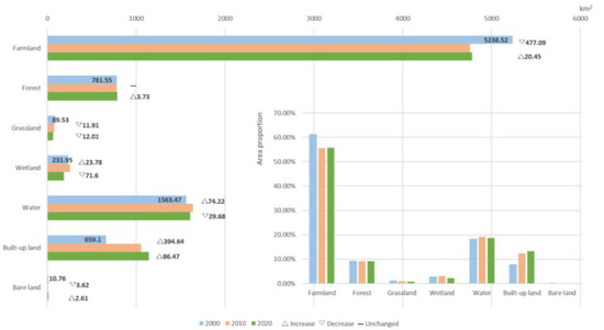 The data of land use changes in the three periods of 2000, 2010, and 2020 are counted to obtain the figure of land use type area changes in Wuhan. As can be seen from Figure 3, the overall land use changes in Wuhan during the two decades are mainly characterized by the decrease in farmland and the increase in built-up land. During this period, the farmland area decreased by 456.94 km2, and the change was more drastic in the first period and increased in the later period. The built-up land has increased the most in these 20 years, with an increase of 481.11 km2, of which the increase in the first ten years was 394.63 km2, while the increase in the area of built-up land between 2010 and 2020 was relatively small. In addition to the built-up land, the area of water and forest also increased. The rest of the land types have decreased to different degrees, but the decrease is relatively small. Farmland, water, and built-up land are the main land use types in Wuhan, among which the proportion of farmland is the largest, decreasing from 61.09% in 2000 to 55.77% in 2020. This is followed by the water area, whose proportion fluctuates during the study period, increasing from 18.23% in 2000 to 18.75% in 2020. The proportion of built-up land keeps increasing, from 7.69% in 2000 to 13.3% in 2020.