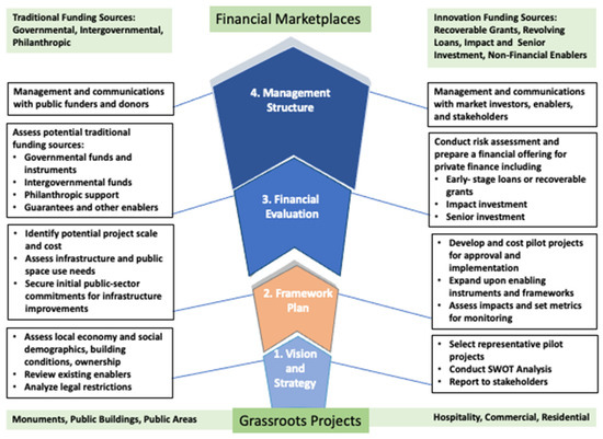 CHiFA’s research, published in 2021 (Section 2 and notes [25,26]), studied models that successfully brought together financing from a range of sources to effect meaningful positive change by transforming derelict heritage areas into dynamic communities. The methodology presented in Section 3 of this paper further proposes a process for integrating public and private interests and opportunities to create an investment dynamic that can attract blended finance. The discussion in Section 4 synthesizes a group of factors that help to facilitate a successful collaborative initiative—high-level political support, capable local leadership, risk mitigation and investment incentives, measurable impacts, and a transparent management structure.