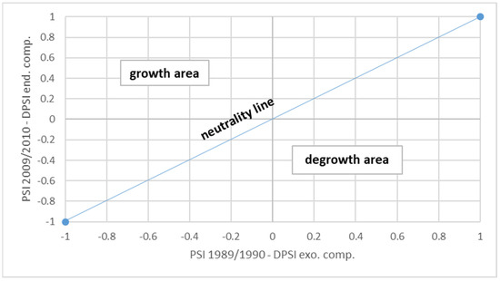 The results of the analyses can be better understood by visualizing them on a Cartesian plane, in which the PSI values for the base year (and the values of the exogenous component of the DPSI) are reported on the abscissa, while the final PSI values (and those of the endogenous component of the DPSI) are reported on the ordinate. The municipalities in which the PSI value remains unchanged are on the diagonal line. In the municipalities to the left of the diagonal, the PSI values have increased compared to the initial values shown in the abscissa, while in those to the right, the PSI values have fallen (Figure 2).