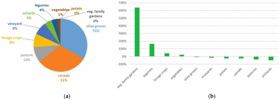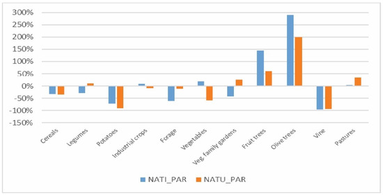 The area devoted to vegetables also increased slightly, although it is concentrated almost exclusively in a small number of municipalities in the PAR_NAC area and two municipalities in the PAR_NAT area, all of which are characterized by the dominance (sometimes quite significant) of the endogenous component over the exogenous (Figure 6a,b).