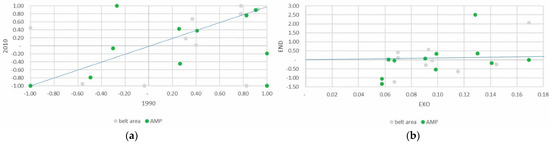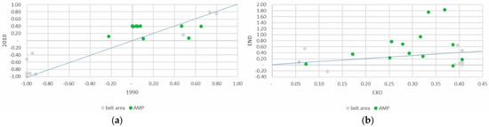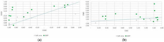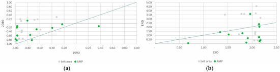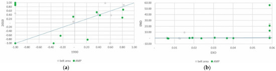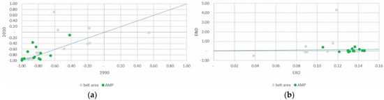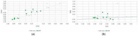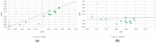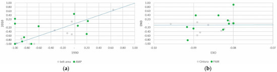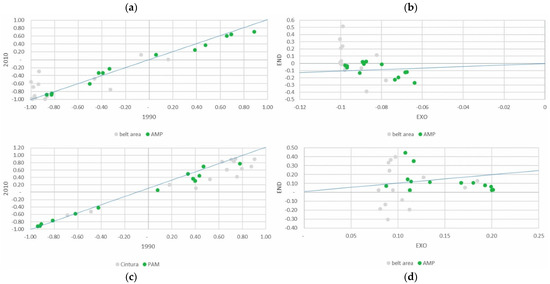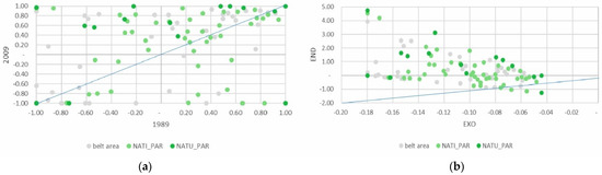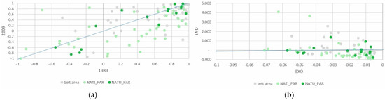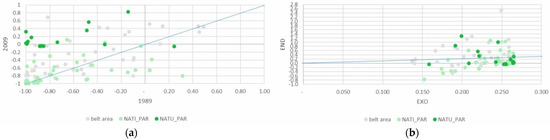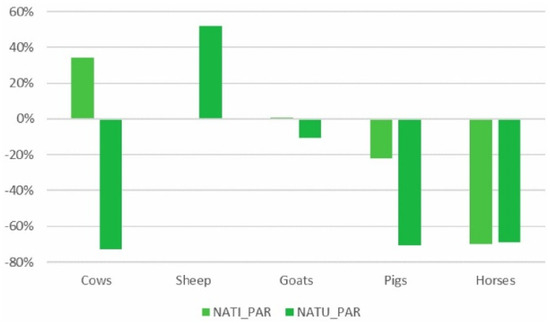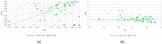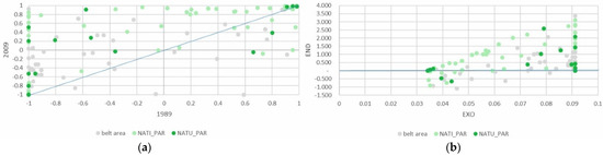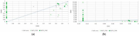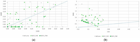 Despite being a minor part of the total agricultural area, the absolute area devoted to family vegetable gardens grew slightly, above all in the PAR_NAT area. Specialization in vegetable gardens for family consumption increased significantly in both areas of the park, clearly influenced, as might be expected, by the endogenous component of the DPSI (Figure 7a,b).