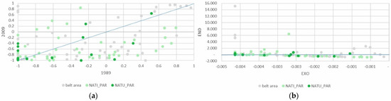 The trend regarding specialization in pasture and meadows is also of interest. This category covers land set aside for animals to graze. In addition to significant increases in the absolute areas devoted to this crop, especially in the PAR_NAC area, there was also a clear increase in specialization following the establishment of the park. As can be seen in Figure 8a,b, almost all municipalities have become more specialized in pasture and meadows. By contrast, the municipalities in the belt tend not to specialize in grazing land and, in some cases, have replaced it with other crops.