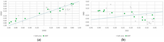 The dynamic analysis of the PSI (DPSI) also highlighted that the increases in olive specialization in both the PAR_NAT and the belt areas were mainly of an endogenous nature. This confirms the correlation between the production trends in these two areas. By contrast, the trend in the PSI in the PAR_NAC area was mainly influenced by exogenous forces, i.e., variations at a regional or national level (Figure 4a,b).