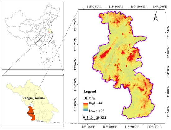 Nanjing, a city in eastern China, southwestern Jiangsu Province, along the lower reaches of the Yangtze River, is a core city of the Yangtze River Delta, with the geographical coordinates of 31°14′–32°37′ N and 118°22′–119°14′ E (see Figure 1). The city straddles the Yangtze River, connecting the Jianghuai Plain to the north and Yangtze River Delta to the east, with a maximum horizontal distance of approximately 70 km from east to west and 150 km from north to south. The city has a long north–south and narrow east–west plan, covering an area of 6587 km2. Nanjing has experienced a high level of urbanization and rapid economic development, which has led to dramatic changes in land use types and an uneven land use structure conflicting with ecosystem gradually. This study analyzed whether there was a spatial correlation between the landscape pattern index, which characterized land use patterns, and ESV in Nanjing and, if so, further explored the impact of changes in land use patterns on the ESV.