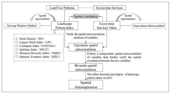 The technical framework of this study is illustrated in Figure 2. The landscape pattern index was represented using the moving window method, and the ESV was represented using the equivalence factor method. If the variables were spatially autocorrelated, the effect degree of the landscape pattern index on the ESV would be analyzed by spatial autoregression. This study attempted to explore the response of ecosystem services triggered by changes in land spatial structure due to the fact of urban land stress through a spatial analysis approach.