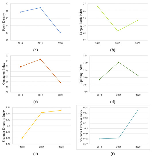 Landscape pattern index in Nanjing for three years. (a) PD values; (b) LPI values; (c) CONTAG values; (d) SPLIT values; (e) SHDI values; (f) SHEI values.