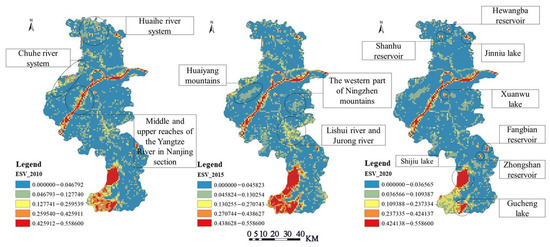 Based on the scope of Nanjing City, 1 × 1 km grid cells were selected as the scale of analysis, the ESV of grid cells in the study area was calculated, and their spatial distribution results were analyzed as shown in Figure 4. From 2010 to 2020, the ESV of the Nanjing grid cell changed significantly, and the scale and ductility of ESV high-value areas decreased. In 2020, the high ESV concentration areas were the Hewangba Reservoir, Jinniu Lake, and Shanhu Reservoirs in Liuhe District; Xuanwu Lake in Xuanwu District; Fangbian Reservoir and Zhongshan Reservoir in Lishui District; Gucheng Lake in Gaochun District; Shijiu Lake in Lishui District; Gaochun District. In 2010, the Huaihe River system in the northern part of the city, the Chuhe River system in the northwestern part of the city, and the middle and upper reaches of the Yangtze River in the Nanjing section were high-concentration areas of ESV, which declined by varying degrees in 2015 and 2020. The main reason for this was that large-scale polder and construction land occupation caused water, forests, and unused land to decline, weakening the ecological value of the land. In 2015, the Huaiyang Mountains, represented by the Laoshan Forest Farm in the central part of Pukou District; the western part of the Ningzhen Mountains, represented by the Qinglong Mountains and Tangshan Mountains in the northeast of Jiangning District; the river systems, represented by the Lishui River and Jurong River in the south, formed large-scale concentrations of ESV. In 2020, the river systems of the Lishui River and Jurong River were seriously eroded by construction, and cropland and large areas of water disappeared, resulting in a significant decrease in the ESV.