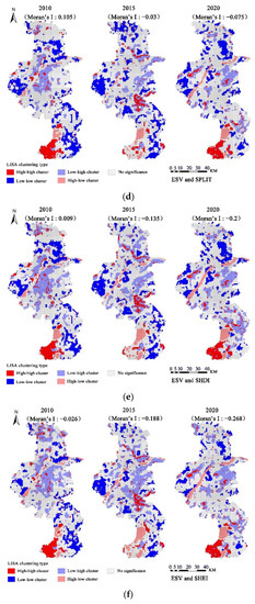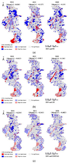 In GeoDa, ESV was used as the first variable and the landscape pattern indices (i.e., PD, CONTAG, SPLIT, LPI, and SHEI) were used as the second variables to analyze the spatial correlation between the two. To assess the degree of spatial autocorrelation between the variables, Moran’s I and local indicators of spatial association (LISA) were calculated and tested for the presence of aggregation and divergence against the null hypothesis of no autocorrelation; both resulted significant by means of a z-test at a level p < 0.05. The results are shown in Figure 5.