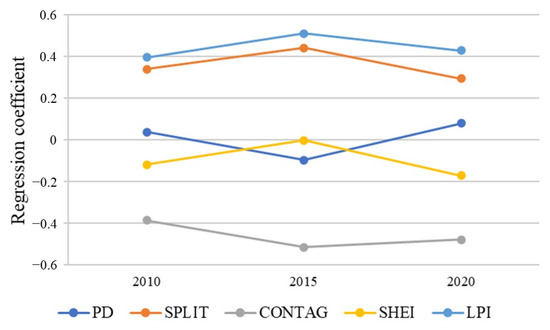 The model parameters are shown in Figure 6. From 2010 to 2020, the absolute values of the regression coefficients of LPI and CONTAG were higher than those of other pattern indices. The regression coefficient of LPI increased from 0.396 (2010) to 0.511 (2015) and finally decreased to 0.428 (2020). The regression coefficient of CONTAG decreased from −0.385 (2010) to −0.514 (2015) and finally increased to −0.478 (2020). The absolute values of the two coefficients still showed an overall increasing trend over time, indicating that the influence of LPI and CONTAG on ESV gradually increased and became dominant, with a significant positive effect of LPI on ESV and a significant negative effect of CONTAG. The regression coefficient of SPLIT increased from 0.34 (2010) to 0.442 (2015) and finally decreased to 0.295 (2020), with an overall decreasing trend. SPLIT was an index of landscape patterns that significantly affected ESV, in addition to LPI and CONTAG, with which it was spatially positively correlated. In addition, there was a significant negative correlation between SHEI and ESV in all three years, but with a weaker effect than LPI, CONTAG, and SPLIT. The regression coefficient of PD decreased from 0.037 (2010) to −0.096 (2015) and, finally, increased to 0.079 (2020). However, overall, the degree of the PD’s positive drive on ESV increased and had the weakest effect.