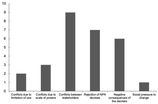 There were six topics represented as codes related to conflicts. The four most frequent were: conflicts due to scale power, between stakeholders, natural protected area rejection, and negative effects resulting from a decree (Figure 2).