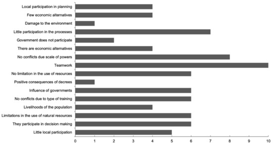 The interviewees commented that although there is a certain amount of rivalry in terms of power and the type of training of those involved in conservation issues, they have managed to control the situation because most of the activities are voluntary, where participation is diverse and everyone contributes their knowledge, different disciplines are integrated, and there is teamwork, both with the localities and the organizations. Limitations on the use of natural resources are due to norms and agreements that allow for their regulation. Regarding planning issues and local participation, it depends on the aspect being discussed, since some points are very specialized and it is difficult to reach a consensus on the decision, so only experts in the field participate. The communities depend on local resources, so they need to know the decrees, because of the need for them for their economic development and social dynamics, and this is an aspect that has been strengthened, as they have been able to learn more about the measures and regulations related to the project, all of which has awakened environmental awareness in the region.