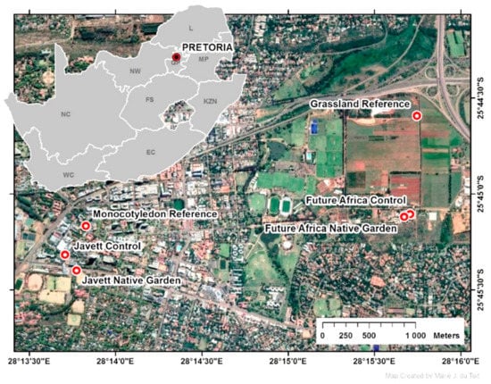 Green spaces vary greatly in terms of their insect conservation value according to their history, size, functional connectivity, heterogeneity and vegetation type, structure, and volume []. For similar urban history and functional connectivity, all six gardens were within a 2 km radius of one another (see Figure 1). Situated on the century-old campuses of the University of Pretoria, which is located 6 km from the city center, the area is considered representative of the age and urban development of the city (see Figure 1). The University’s grounds provide for the ownership, continued access, and management of the interventions/gardens.